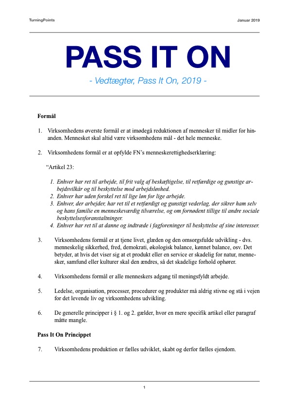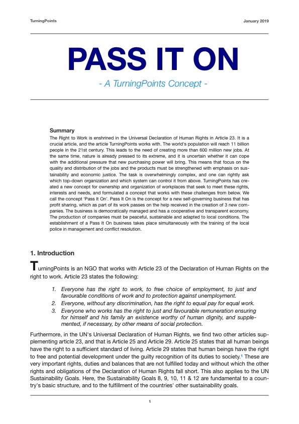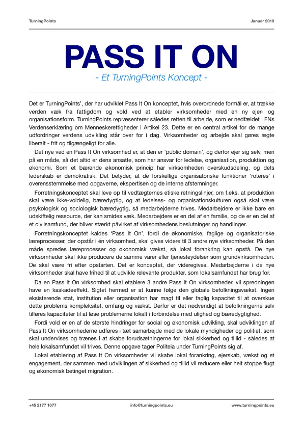 TurningPoints har skabt et nyt koncept for ejerskab og organisering af arbejds- pladser, som søger at opfylde disse rettigheder, behov og som gør det nedefra. Konceptet kalder vi ‘Pass It On’. Pass It On er konceptet for en ny selvejende virksomhedstype, der har overskudsdeling, der som en del af sit virke giver hjælpen videre i skabelsen af 3 nye virksomheder. Virksomheden er demokratisk ledet, og har en samarbejdende og transparent økonomi. Virksomhedernes produktion skal være fredelig, bæredygtig og tilpasset lokale forhold.