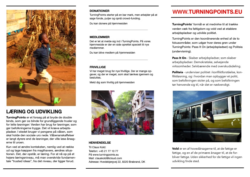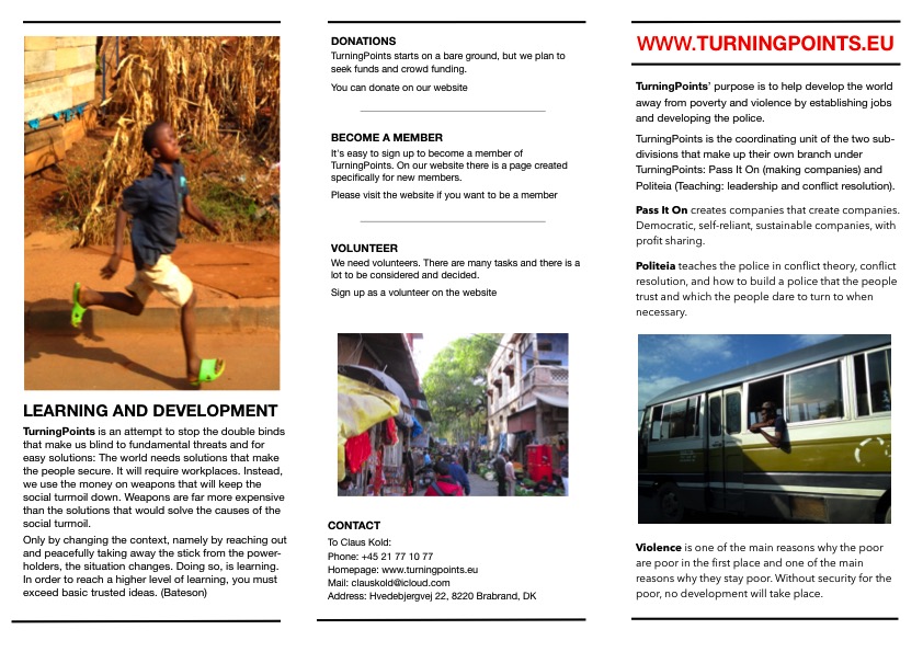 TurningPoints’ purpose is to help develop the world away from poverty and violence by establishing jobs and developing the police. TurningPoints is the coordinating unit of the two sub- divisions that make up their own branch under TurningPoints: Pass It On (making companies) and Politeia (Teaching: leadership and conflict resolution).