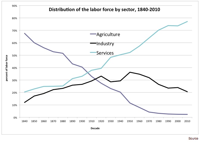 What we see is that agriculture uses only 3-5 % of the labour force, and industry is almost steady with only an increase of 10 %. The distribution shown above is what we see in the USA, but the over-all picture is the same in other countries. (See: https://www.bea.gov) In the near future we will see a fusion of machines and artificial intelligence – called robots – probably reducing jobs in both industries more, once again. When it comes to services artificial intelligence will take its toll on many routine jobs, because their routines can be turned into an algorithm.
