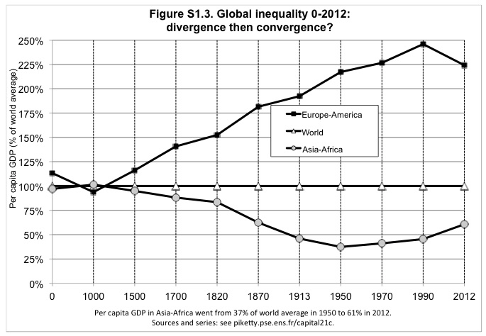 Above. Thomas Piketty in 2013 showed that inequality is rising - and also that it is not work that reduces inequality. According to Piketty, wealth is rising for the 0.1 % because of inhertance and the ownership of shares. Both of which are not related to your own work, but the work of others.